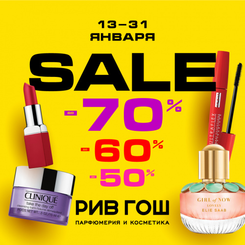 РИВ ГОШ не изменяет традициям и балует вас в первый месяц года скидками до 50%, 60%, 70% на парфюмерию, косметику и уход.